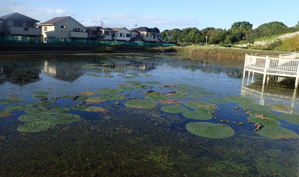 狐狸ヶ池ではアカミミガメ防除により希少水生植物種のオニバスが出現しました(2016年10月撮影)。