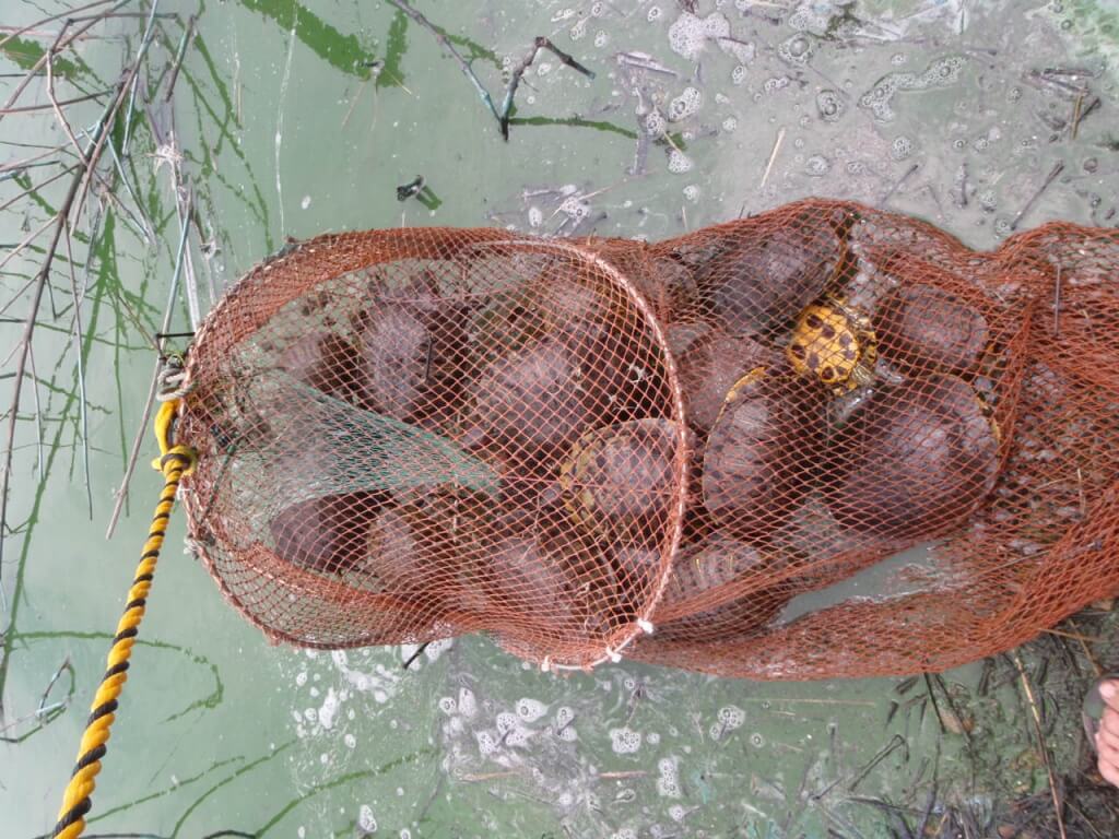 餌で誘引して捕獲する誘引罠で捕獲される大量のアカミミガメたち